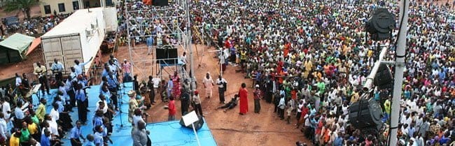 Every night seemed to grow and grow. It’s hard to get a clear figure of the new state of Yambio Headquarters but we estimate the town population to be approximately 20 to 30 thousand people. What was remarkable that the Lord drew most of the population to the meeting on Sunday? After an hour or so of jubilant praise and singing I took the microphone and started to preach the Gospel, suddenly the crowd beginning to scatter. Another fierce storm was rapidly approaching! We prayed asking the Lord to hold back the rain and the Lord totally stopped the rain, this was a real sign to the people that Jesus is alive. Most of the crowd returned and the Lord moved seeking and saving the Lost.