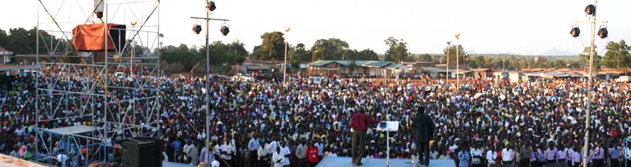 Pastor Jack Hanes Ministered on Thursday night Powerfully preaching  a message to a responsive crowd of 7 thousand or more.  What was remarkable was that all around the city of Yei it was raining heavenly yet the Freedom Square was perfectly dry!   Not a drop of earthly rain fell only the rain from heaven that wets the soul and quenches mans greatest thirst.